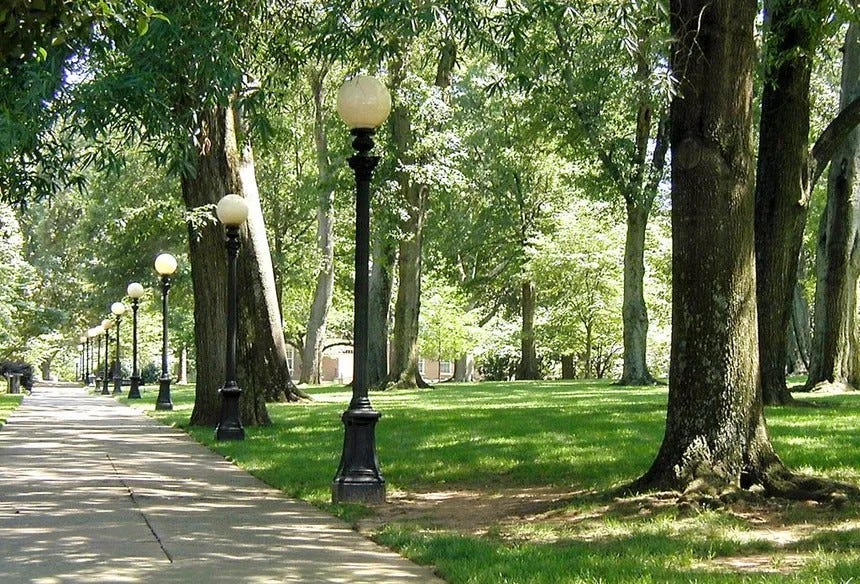 With the descent of darkness, I strolled up the hill, along the west side of north campus, and past a colonnade of cast iron lampposts leading to the university arch.