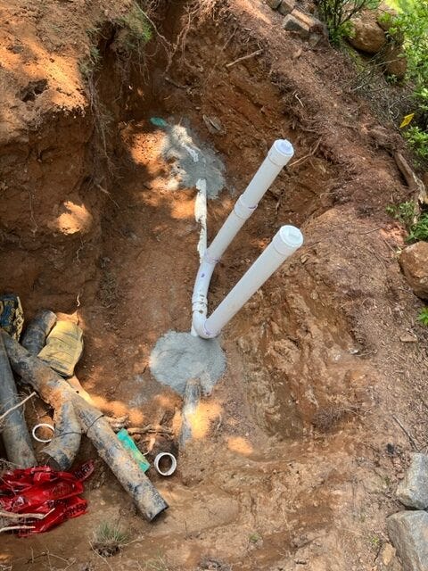 Within a few hours, nearby utilities were located, and excavation began. As the hole expanded and mountains of Georgia clay piled on the lawn, we learned the pipe wasn’t quite where we thought, and was in worse shape than we’d imagined.