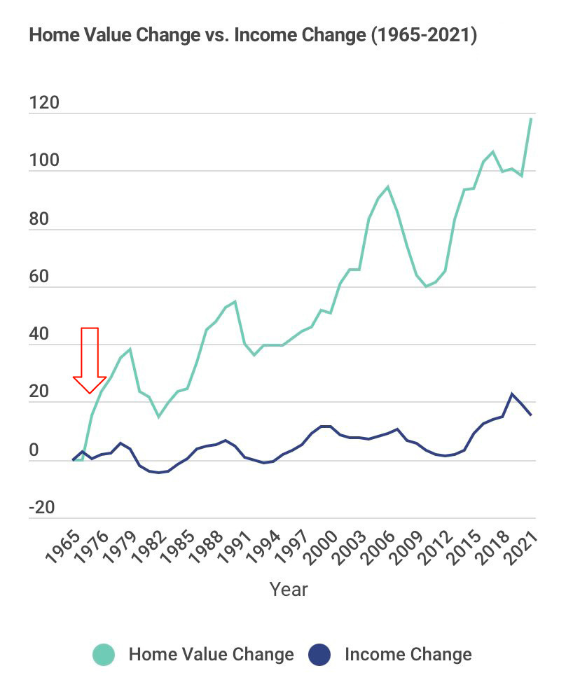 In nominal terms, the median residence fetches about ten times as many dollars as it did fifty years ago… and almost twice what it did at the start of this decade. As I previously detailed here, real earnings have fallen too. There’s no denying that wages have lagged the price of real estate:
