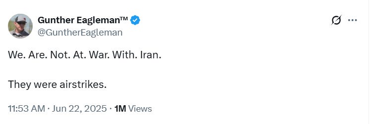 Regardless its tactical merits, the attack on Iran lacked such sanction and was therefore illegal. The president has no Constitutional authority to start a war. That’s why some “conservative” influencers resort to semantic somersaults that would make Bill Clinton blush: